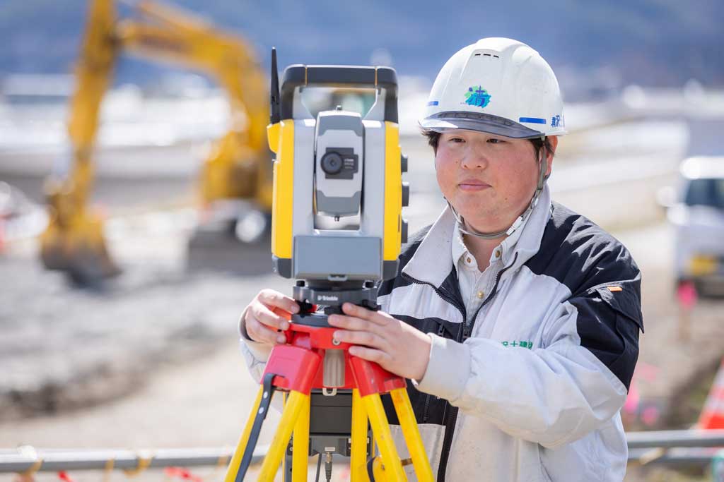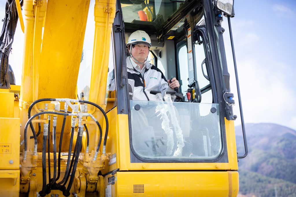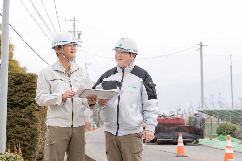 現在は土木工事の現場代理人として、工事全体の管理を担当しています。工程管理や測量、現場での指示出し、書類作成などを行いながら、安全に工事が進むよう現場をまとめる仕事です。道路など地域のインフラに関わる工事も多く、現場の仕事は体力的に大変なこともありますが、その分工事が完成した時には大きな達成感があります。